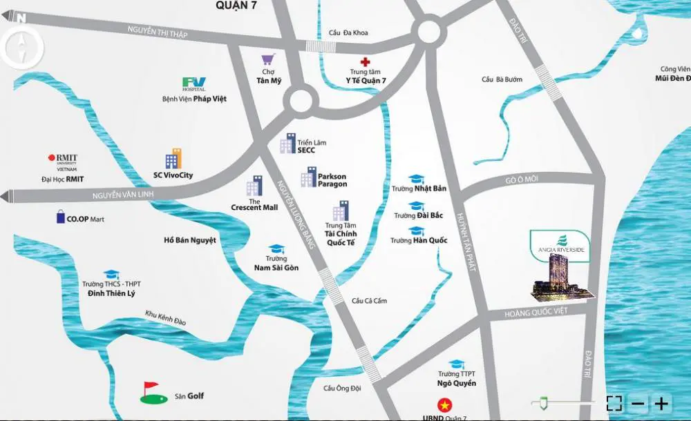 Những lợi thế về vị trí còn giúp cư dân tại An Gia Riverside được thừa hưởng những dịch vụ cao cấp, hệ thống tiện ích hiện đại và đồng bộ của khu vực như: khu dân cư Him Lam, hệ thống siêu thị Lotte Mart, Bệnh viện FV, Viện tim Tâm Đức, Trường ĐH RMIT, Đại học cảnh sát...