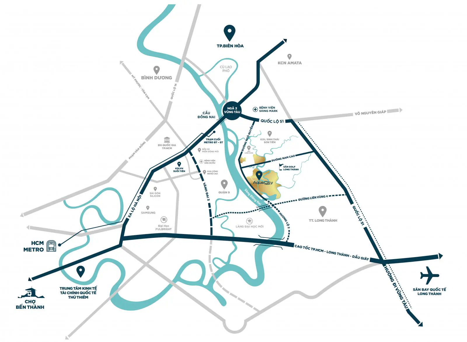 Aqua City được bao quanh bởi 32km bờ sông Đồng Nai thoáng mát và các kênh sông lớn, nhỏ tạo không gian sống sinh thái cho cộng đồng cư dân. Dự án được xem là một trong những dự án bất động sản nghỉ dưỡng đẳng cấp nhất tại khu Đông TP.HCM.