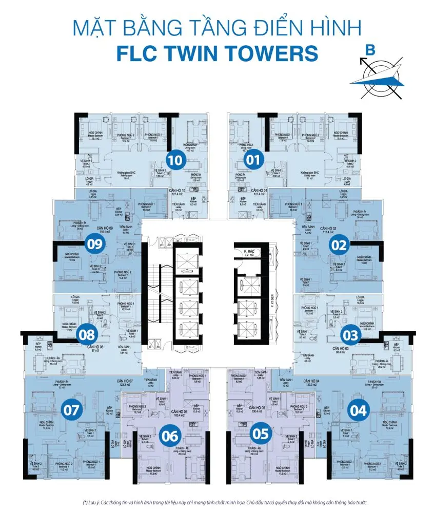 - Căn hộ 03 phòng ngủ có 05 loại diện tích: 100,4m2; 116,1m2; 117,4m2; 123,3m2; 127,4m2