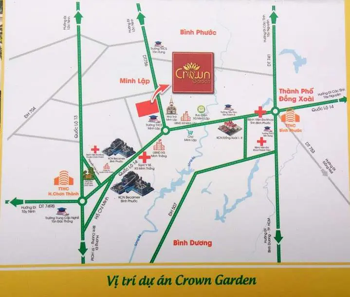 Crown Garden nằm ở vị trí mặt tiền đường 756, huyện Chơn Thành, tỉnh Bình Phước. Dự án có tổng diện tích hơn 32ha, cung ứng hơn 400 lô nền với diện tích rất đa dạng (5x60m, 7x45m, 10x30m, 20x50m, 10x50m…).