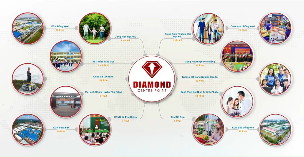 Liên kết vùng: Vị trí dự án Diamond Centre Point dễ dàng kết nối với các trung tâm hành chính, kinh tế, thương mại, giải trí lớn của huyện Phú Riềng, tỉnh Bình Phước cũng như các tỉnh, thành lân cận. Cụ thể: