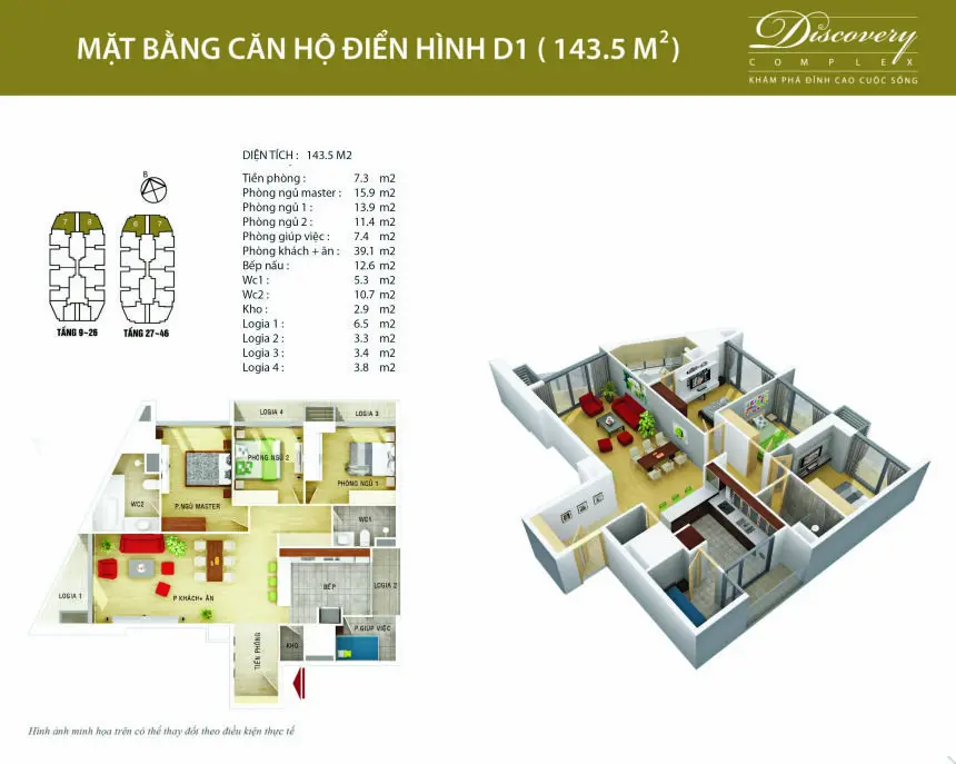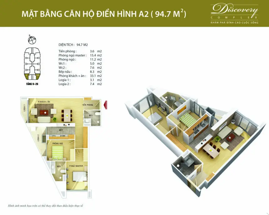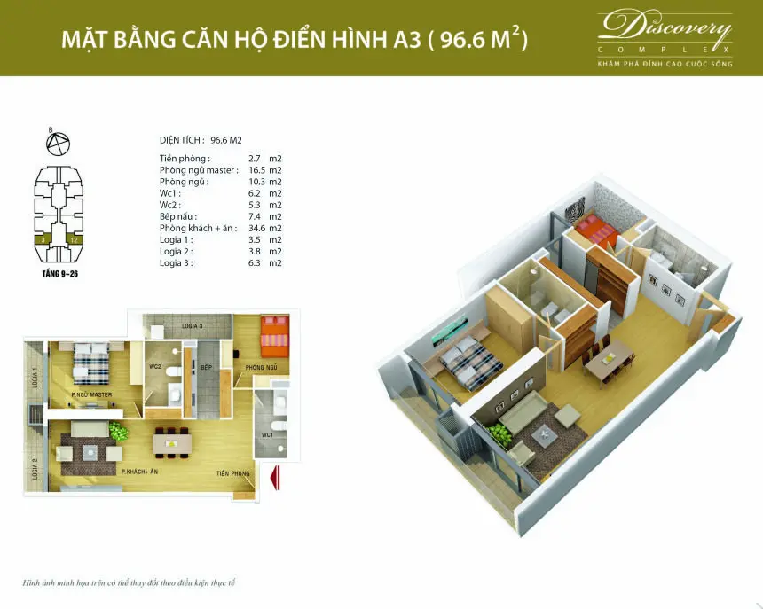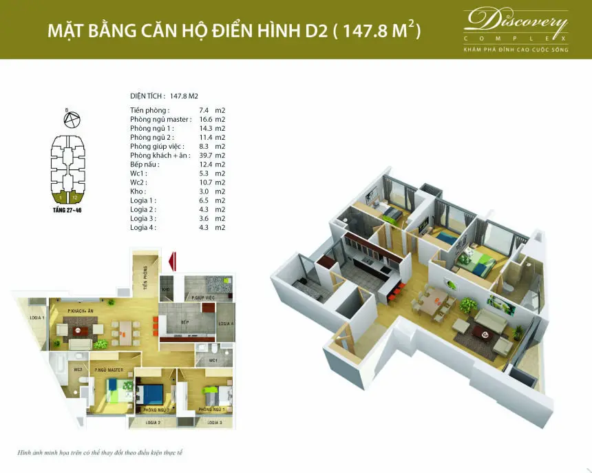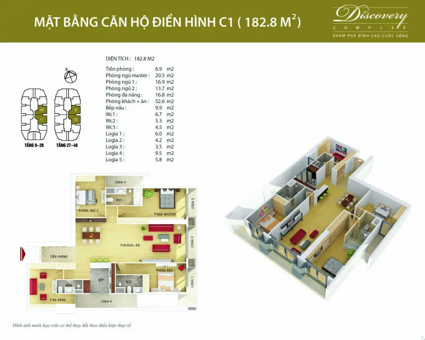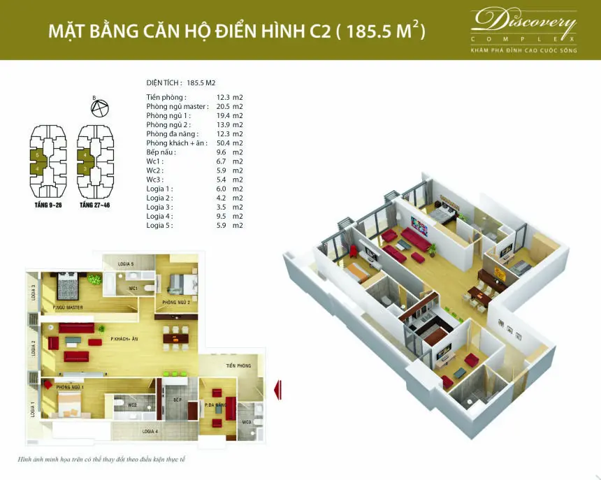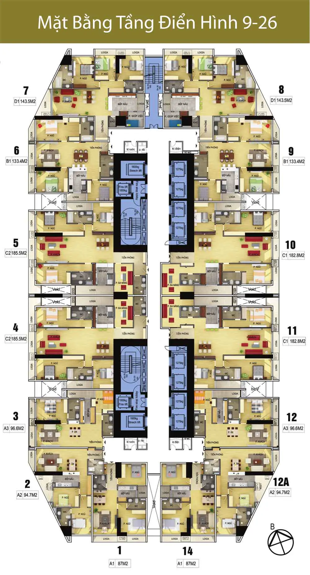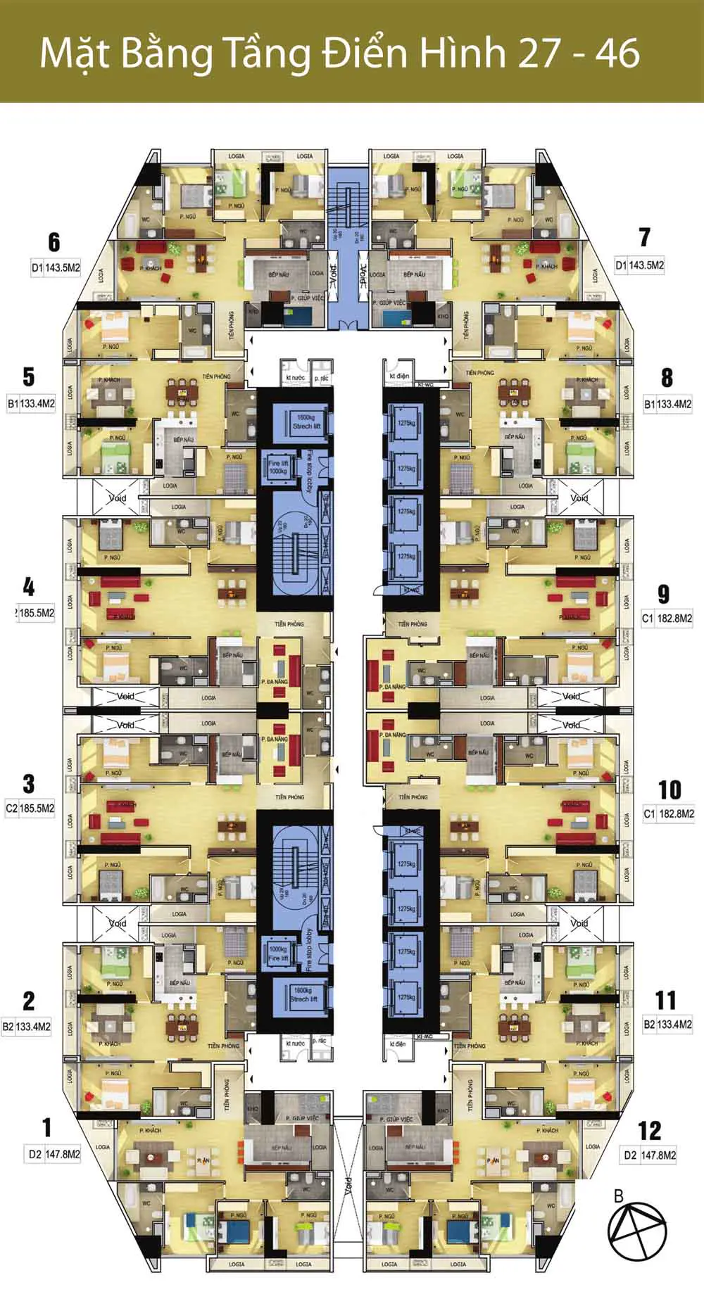 Được bố trí từ tầng 6 tới tầng 50 của tòa tháp (8 căn hộ / 01 tầng) cao 3,3m Ngoài ra, còn có 02 tầng kỹ thuật và 02 tầng cây xanh ở giữa toà tháp và ở tầng mái.