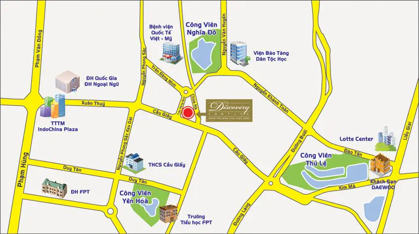 Discovery Complex tọa lạc tại số 302 phố Cầu Giấy, phường Dịch Vọng, quận Cầu Giấy, Hà Nội nằm ngay trục đường chính Cầu Giấy và đường nhánh phố Chùa Hà, phía tây TP. Hà Nội. Nơi đây tập trung các đầu mối giao lưu khu vực và quốc tế là một địa điểm đẹp, giao thông thuận lợi trong việc khai thác gợi mở nhiều hình thức kinh doanh.