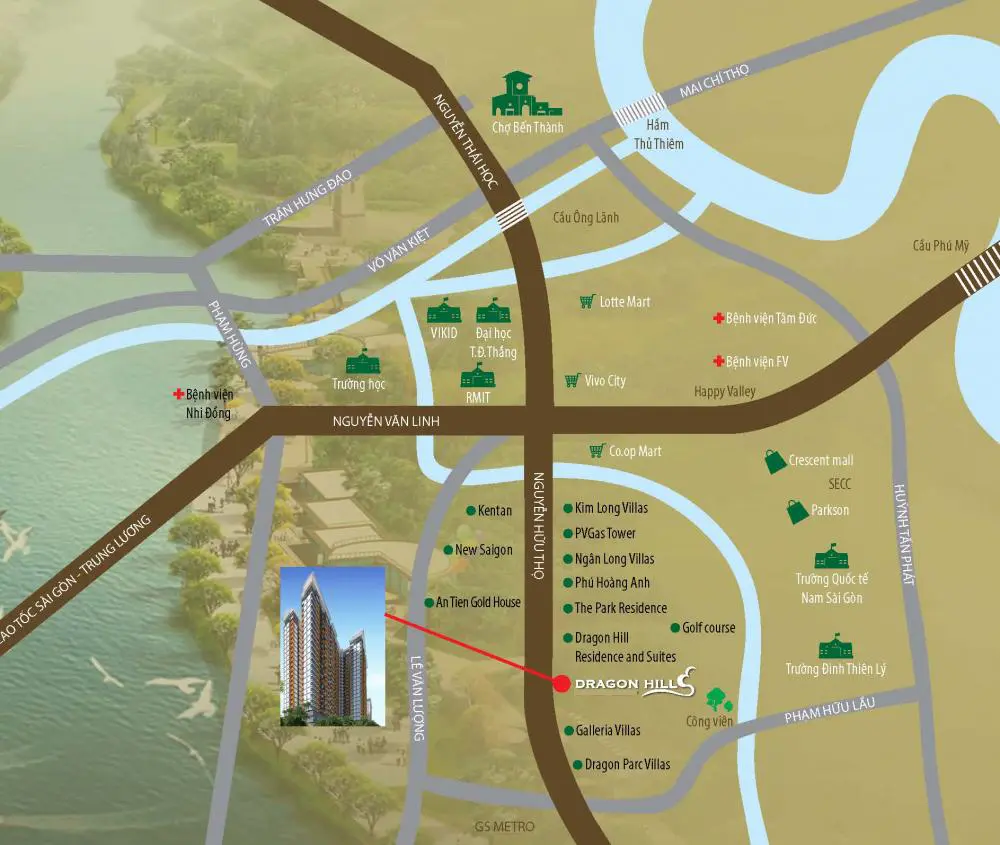 Dragon Hill Residence and Suites 2 sở hữu vị trí “phong thủy thế vượng”, ngay mặt tiền đường Nguyễn Hữu Thọ, nơi giữa mình Rồng Dragon City - vùng đất lành yên bình, tĩnh tại và phồn thịnh. Dự án được thừa hưởng toàn bộ hệ thống cơ sở hạ tầng và các dịch vụ tiện ích tập trung, hiện đại bậc nhất tại nơi tâm điểm cuộc sống khu Nam Sài Gòn.