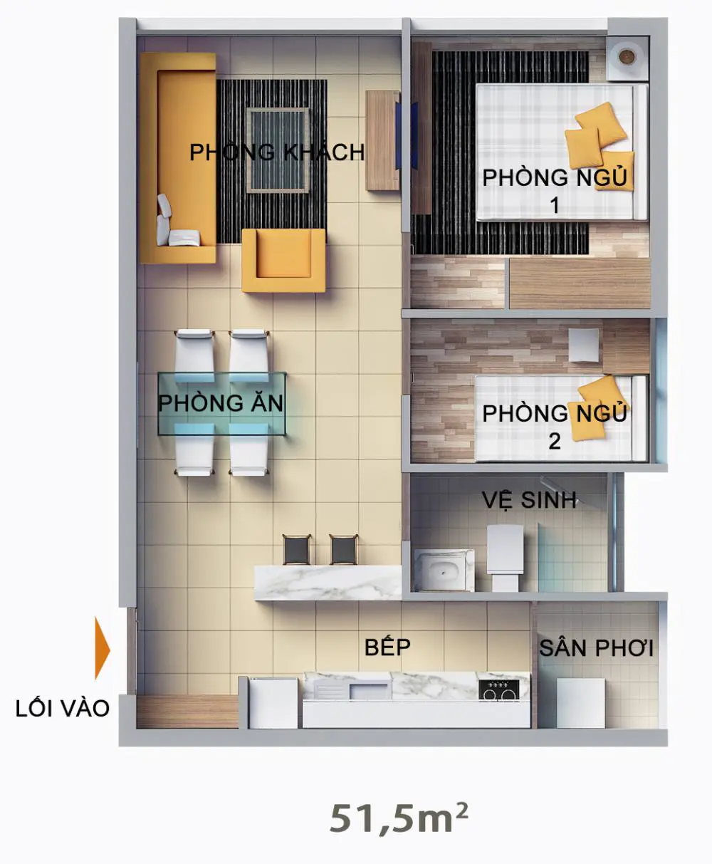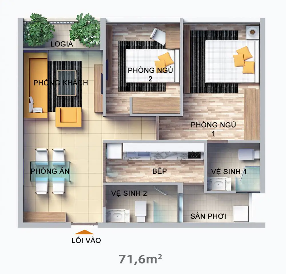 - Diện tích đa dạng từ 54 – 95m2, có 2-3 phòng ngủ.