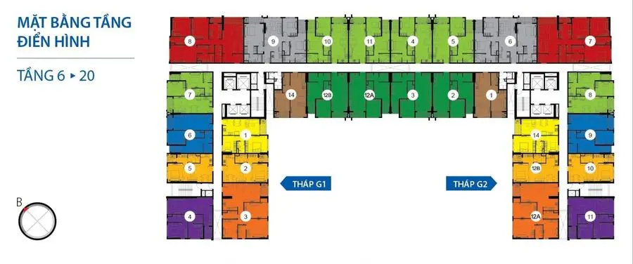 Từ tầng 5-21, một sàn 14 căn hộ với 4 thang máy 2 thang bộ các loại diện tích sau :