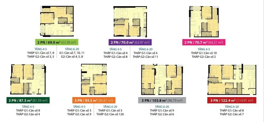 - Căn hộ 3 PN: 87.5m2, 93.5m2, 103.8m2, 122.4m2