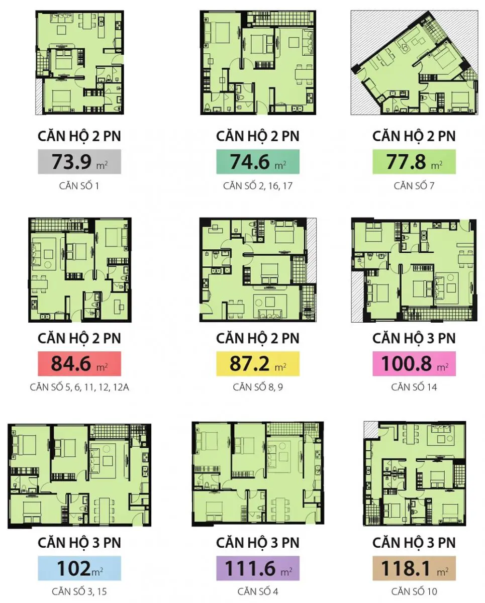 Các căn hộ được bố trí thành 2-3 phòng ngủ với diện tích linh hoạt từ 73,9-118,1m2, đáp ứng mọi nhu cầu và khả năng tài chính của cư dân.