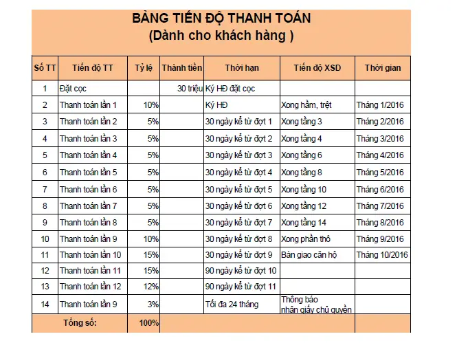 - Phương thức thanh toán kéo dài trong thời gian 24 tháng, khách hàng thanh toán chỉ tới 70% đã nhận căn hộ.