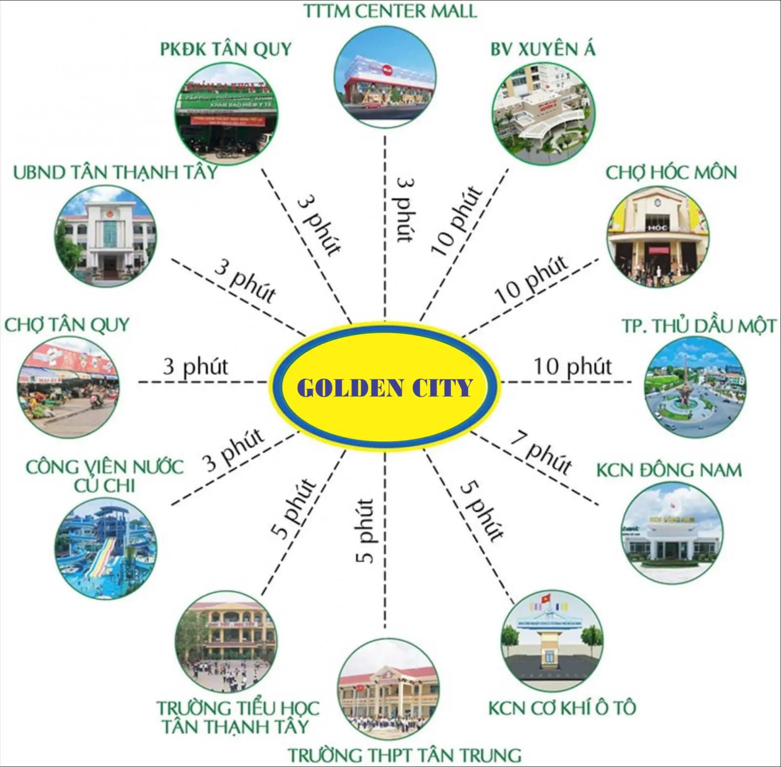 Golden City Củ Chi nằm ngay ngã tư Tân Quy, gần trung tâm thương mại Center Mall Tân Quy, nối với Tỉnh lộ 8. Đây là mạng lưới giao thông huyết mạch của vùng kinh tế trọng điểm Tây Bắc thành phố.