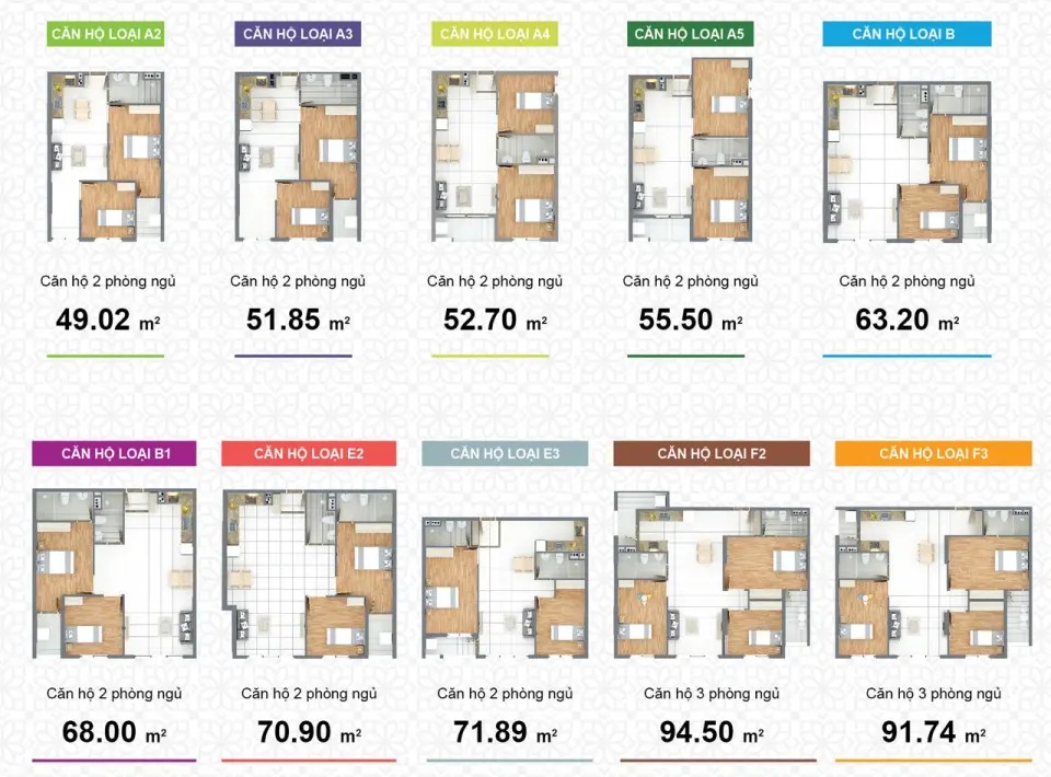 Với thiết kế nhiều loại diện tích khác nhau phù hợp với nhu cầu ngày càng đa dạng của người mua, các căn hộ có diện tích từ 50-92m2, tương ứng căn 2 và 3 phòng ngủ. Phong cách thiết kế ấn tượng, ban công thoáng rộng, tối ưu ánh sáng và gió tươi, giúp mang đến nguồn sinh khí từ bên ngoài vào trong mọi không gian.
