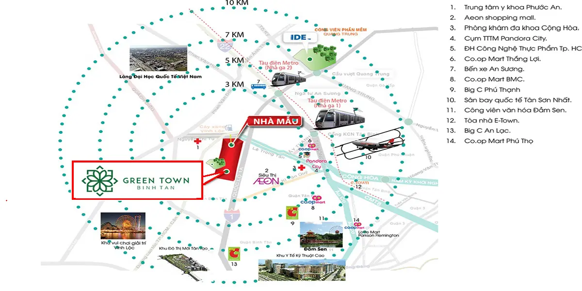 Ngoài ra, căn hộ Green Town sở hữu vị trí trung tâm hành chính của quận Bình Tân, nằm cách UBND không xa, thuận lợi cho cuộc sống của cư dân. Xung quanh dự án các công trình quy mô lớn như làng đại học Quốc Tế Việt Nam, khu y tế kỹ thuật cao, khu công viên giải trí Vĩnh Lộc có quy hoạch 924 ha, những dự án này đều có vốn đầu tư từ nước ngoài.