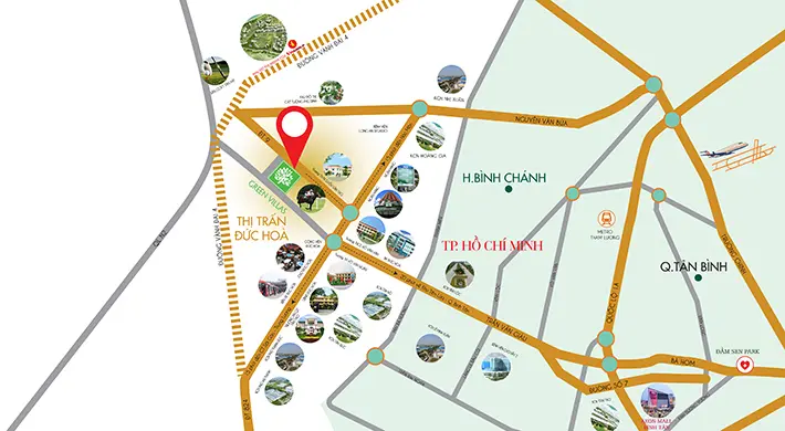 Green Villas tọa lạc ngay cạnh đường DT9 đang mở rộng, nối liền với tuyến đường huyết mạch TL 824, thuộc địa phận xã Đức Hoà Thượng, Đức Hòa, Long An. Nhờ vậy, cư dân có thể nhanh chóng kết nối với các quận huyện xung quanh như Quận 12, Tân Bình, Gò Vấp,...