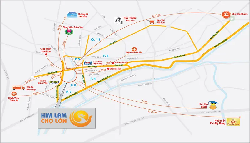 Him Lam Chợ Lớn nằm trên Đường Hậu Giang, phường 11, Quận 6, Tp.HCM, nằm cách mặt tiền Hậu Giang khoảng 120m. Dự án kết nối với khu vực Chợ Lớn khoảng 1,8 km, đại lộ Võ Văn Kiệt khoảng 1,6km, Metro Bình Phú, công viên Bình Phú khoảng 1km, bến xe Miền Tây 2,6km, bến xe Chợ Lớn 2,2km… - một vị trí đắc địa và thuận lợi cho việc đi lại của cộng đồng cư dân nơi đây.