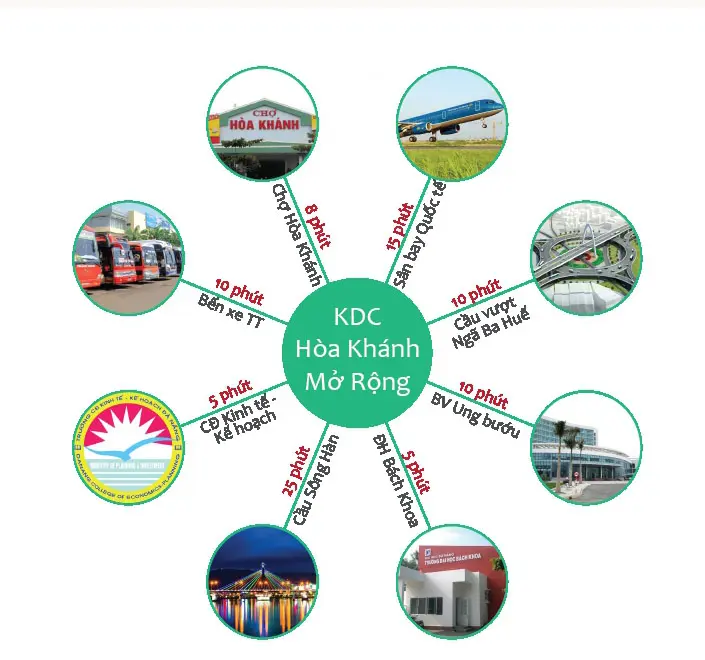 Dự án chỉ cách chợ Hòa Khánh chưa đầy 8 phút, ngã ba Huế 10 phút, bến xe trung tâm 10 phút, cách bãi biễn Nguyễn Tất Thành chưa đầy 10 phút và đặc biệt, bạn có thể di chuyển đến Bà nà Hills qua đường quốc lộ 1A trên trục đường số 5 của dự án.