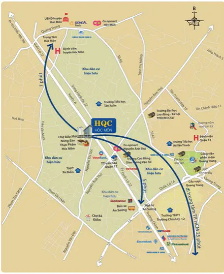 - Chỉ mất 7 phút để đến trung tâm hành chính Ủy ban nhân dân huyện Hóc Môn, Bệnh viện Hóc Môn, siêu thị Metro, Coopmart, khu - công nghệ phần mềm Quang Trung, cách nút giao thông An Sương chỉ 5 phút và mất 25 phút để đến được trung tâm TP.HCM.