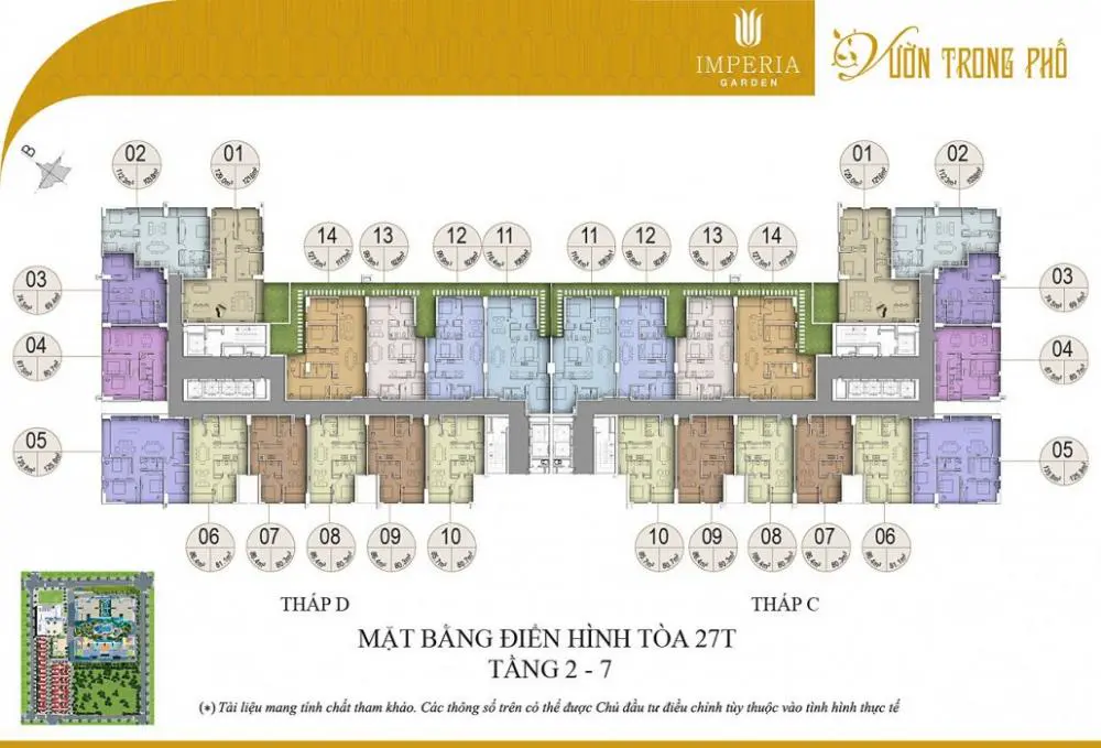 - Mật độ: 14 căn hộ/sàn, 7 thang máy
