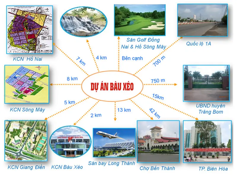 Khu đô thị Bàu Xéo sở hữu 2 mặt tiền Quốc lộ 1 A và đường Trảng Bom - An Viên Đồi 61, liền kề Khu công nghiệp Bàu Xéo, trung tâm thị trấn Trảng Bom, tỉnh Đồng Nam.