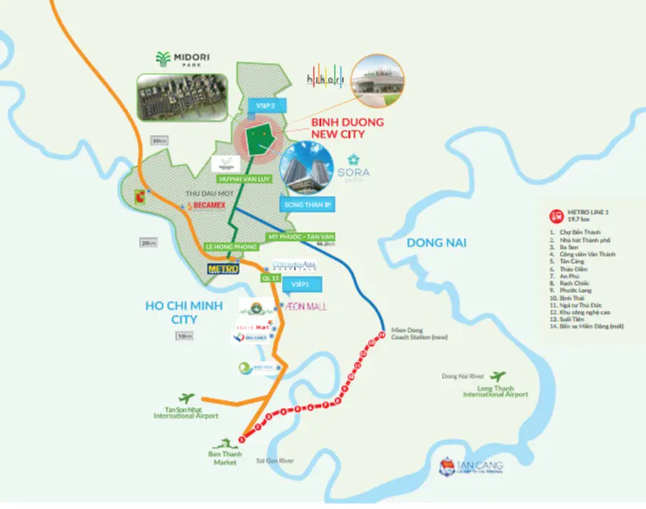 - Aeon Mall Bình Dương, siêu thị Metro Bình Dương: 20-30 phút