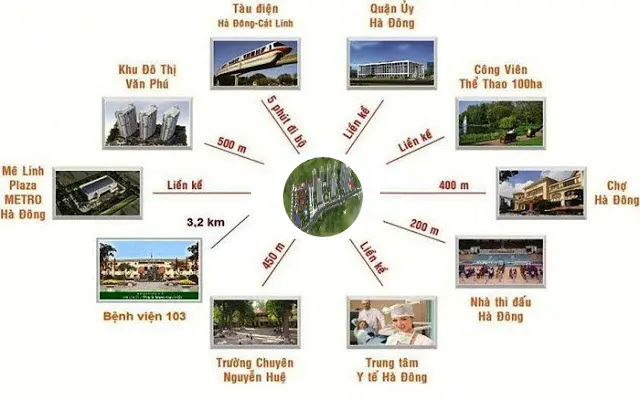 Dự án chỉ cách trường tiểu học Kiến Hưng gần 1km, cách bệnh viện Quan y 103 gần 2,5km, cách vùng quy hoạch cây xanh, hồ nước, khu vui chơi giải trí (với diện tích trên 100 ha) khoảng 1.5km, cách trung tâm mua sắm và hành chính của quận Hà Đông 3.2km.