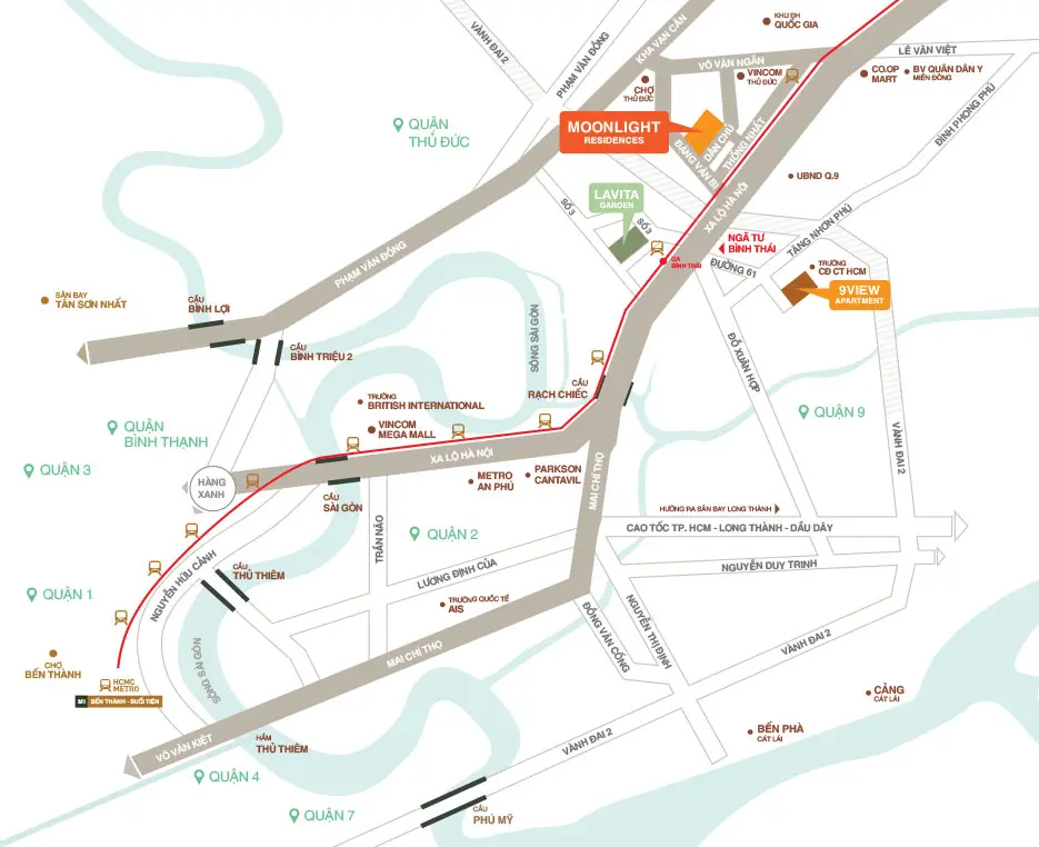 Căn hộ Moonlight Residences nằm tại mặt tiền đường Đặng Văn Bi và Dân Chủ, trong khu dân cư sầm uất của thành phố Thủ Đức. Xung quanh là hạ tầng giao thông hiện hữu khá hoàn chỉnh như tuyến đường huyết mạch Phạm Văn Đồng, xa lộ Hà Nội, metro Bến Thành - Suối Tiên... Từ dự án thuận tiện kết nối tới mọi tiện ích phục vụ nhu cầu giải trí, học tập, làm việc và sinh hoạt của cư dân. Cụ thể như: