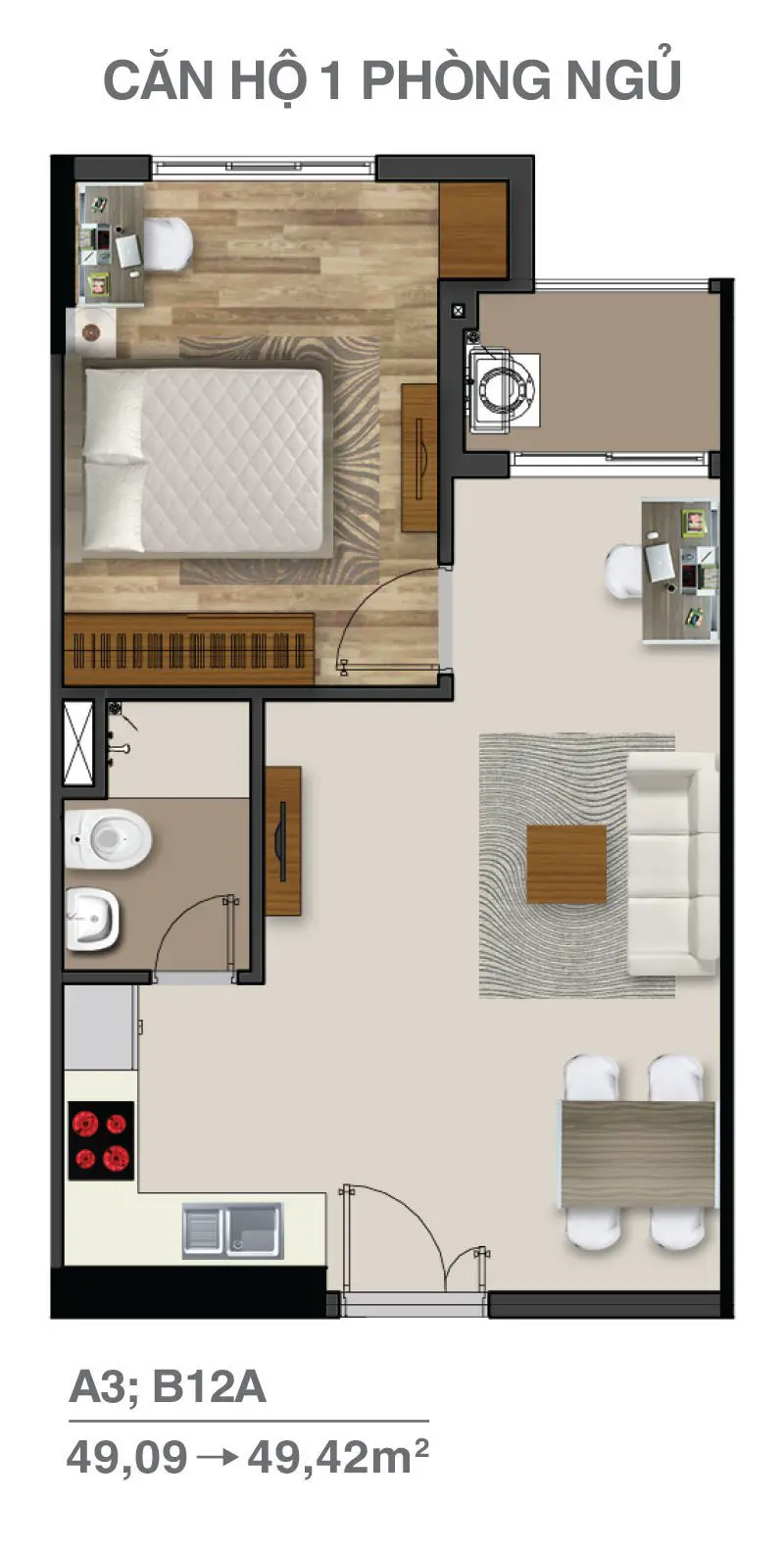 Căn hộ bàn giao: Hoàn thiện nội thất cơ bản như sàn, trần, bàn tủ bếp, thiết bị vệ sinh...