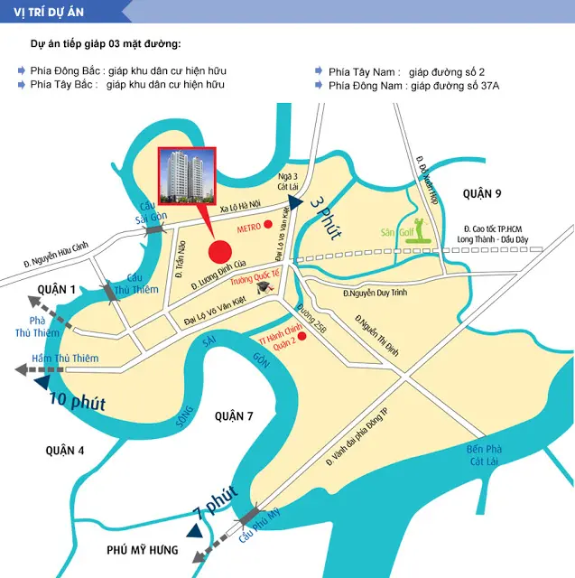 - Cách trung tâm quận 1 chỉ 5 phút qua cầu Sài Gòn, Hầm Thủ Thiêm hoặc cầu Thủ Thiêm