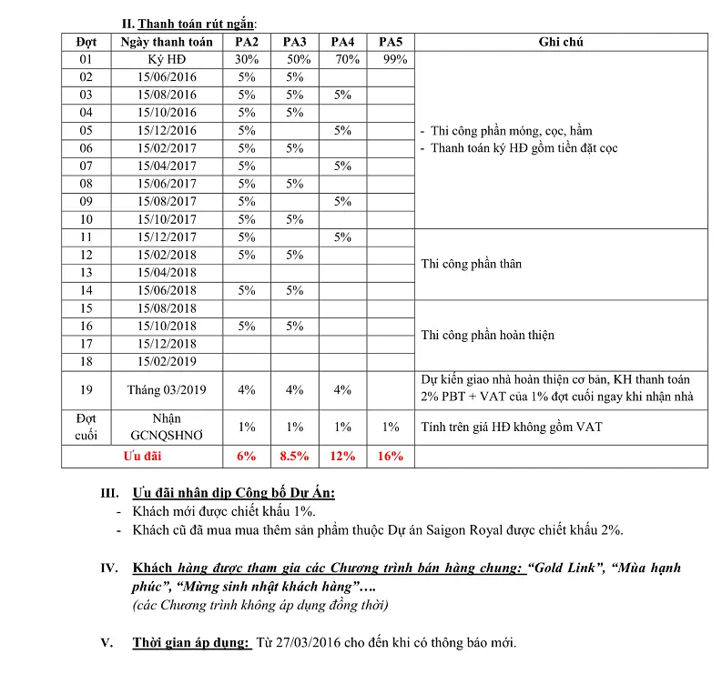 I. Lịch thanh toán tiêu chuẩn (PA1 – Khách hàng thanh toán trực tiếp cho Chủ đầu tư):