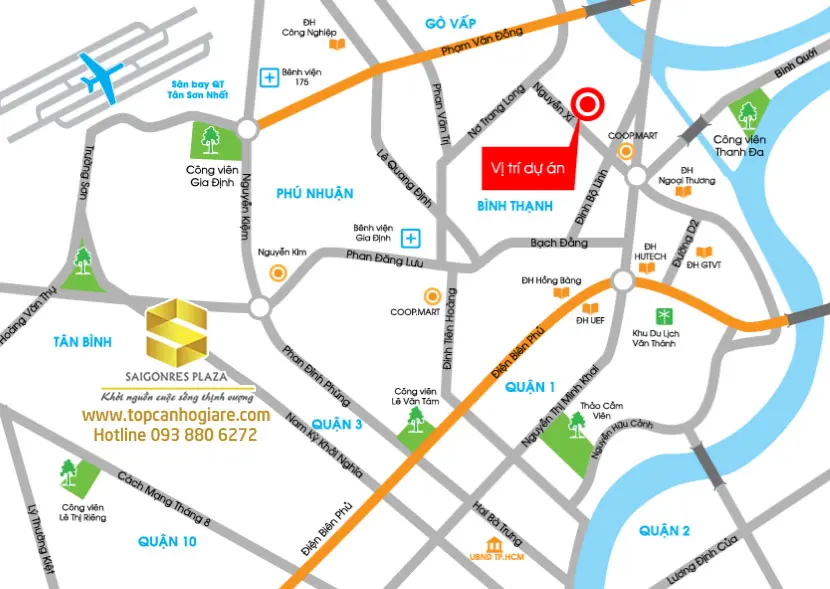 - Từ căn hộ chung cư Saigonres Plaza bạn di chuyển ra sân bay Quốc tế Tân Sơn Nhất chỉ mất chưa đến 10 phút. Rất thuận tiện cho việc giao thương kinh tế cả trong và ngoài nước.