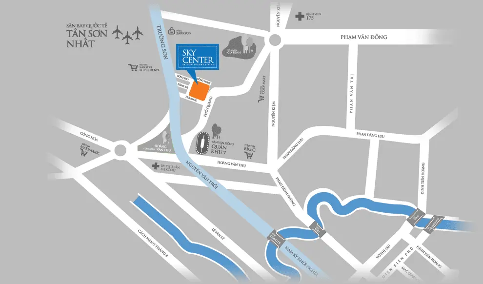 Sky Center Phổ Quang sở hữu 4 mặt tiền đường là Phổ Quang – Trà Khúc – Sông Đà – Sông Nhuệ. Dự án cách Công viên Hoàng Văn Thụ 350 m và cách đường Trường Sơn 200 m.