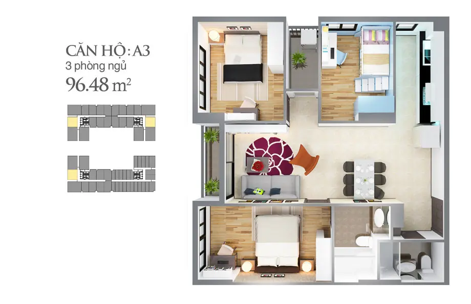 - Căn hộ 3 phòng ngủ 3WC giá từ 6,2 - 6,8 tỷ, cho thuê 17 - 19 triệu/tháng