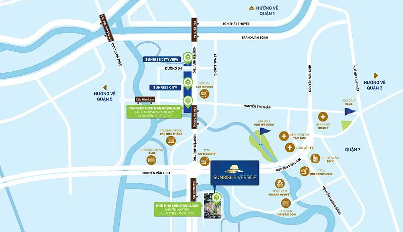 Chung cư Sunrise Riverside tọa lạc trên tuyến đường huyết mạch Nguyễn Hữu Thọ xã Phước Kiển, huyện Nhà Bè. Trục đường Nguyễn Hữu Thọ vốn được xem là vị trí huyết mạch của hệ thống giao thông phía cửa Nam và toàn thành phố. Đây là nơi kết nối giữa nhiều tuyến đường lớn cũng như các khu trung tâm đông đúc khác. Nằm tại vị trí này, dự án Sunrise Riverside giúp cư dân di chuyển nhanh chòng đến các tiện ích ngoại khu hiện hữu như: