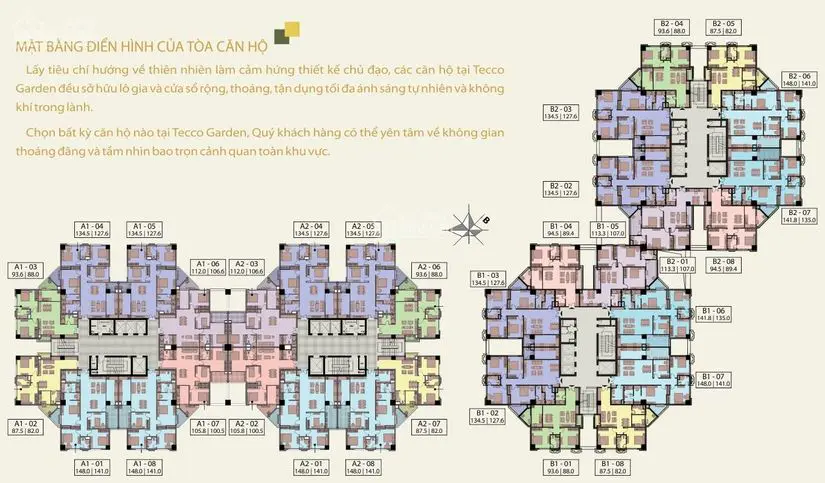 Dự án chung cư Tecco Garden Thanh Trì bao gồm 4 tòa tháp chung cư cao 25 tầng, với 736 căn hộ có diện tích từ 87 – 148m2. Nhờ lợi thế quỹ đất rộng nên 4 tháp căn hộ được sắp xếp theo hướng mở ra, đảm bảo độ thông thoáng. Toàn bộ 100% căn hộ đều có view nhìn ra không gian bên ngoài.