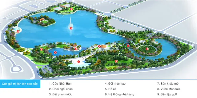 - Khu quảng trường trung tâm và hồ nước rộng 15 ha
