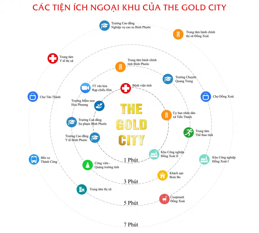 Khu đô thị The Gold City nằm trên địa phận Ấp 02, xã Tiến Thành, thị xã Đồng Xoài, Bình Phước. Dự án sở hữu 4 tuyến lớn với lộ giới từ 28-44m đi ngang qua, gồm đường quy hoạch số 31, 32, 37, đường Tôn Đức Thắng, vô cùng thuận tiện cho việc di chuyển về các tỉnh Tây Nguyên. Đặc biệt, vị trí dự án còn nằm gần Quốc lộ 13 nên việc kết nối đến các tỉnh miền Đông Nam Bộ như Bình Dương, Đồng Nai và Tp.HCM không thể dễ dàng hơn.