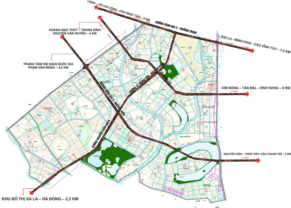 - Phía Tây: Tiếp giáp đại lộ Chu Văn An (Nguyễn Xiển - Xa La).