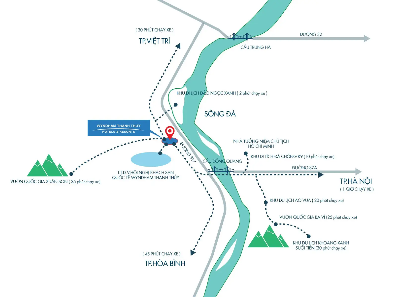 Wyndham Thanh Thủy Hotels & Resorts sở hữu vị trí chiến lược ngay tại trung tâm du lịch nghỉ dưỡng khoáng nóng của xã Bảo Yên, huyện Thanh Thủy, tỉnh Phú Thọ - mang đến cơ hội tốt cho phát triển bất động sản du lịch nghỉ dưỡng kết hợp trị liệu, chăm sóc sức khỏe.