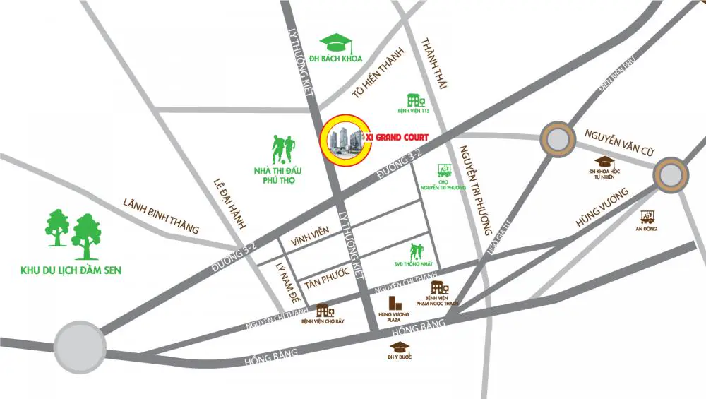 Dự án nằm đối diện nhà thi đấu Phú Thọ, quận 10, TP.HCM. Các mặt tiếp giáp dự án Xi Grand Court:
