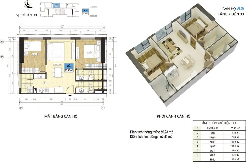 Sơ đồ thiết kế chi tiết căn hộ A3 Xuân Mai Riverside