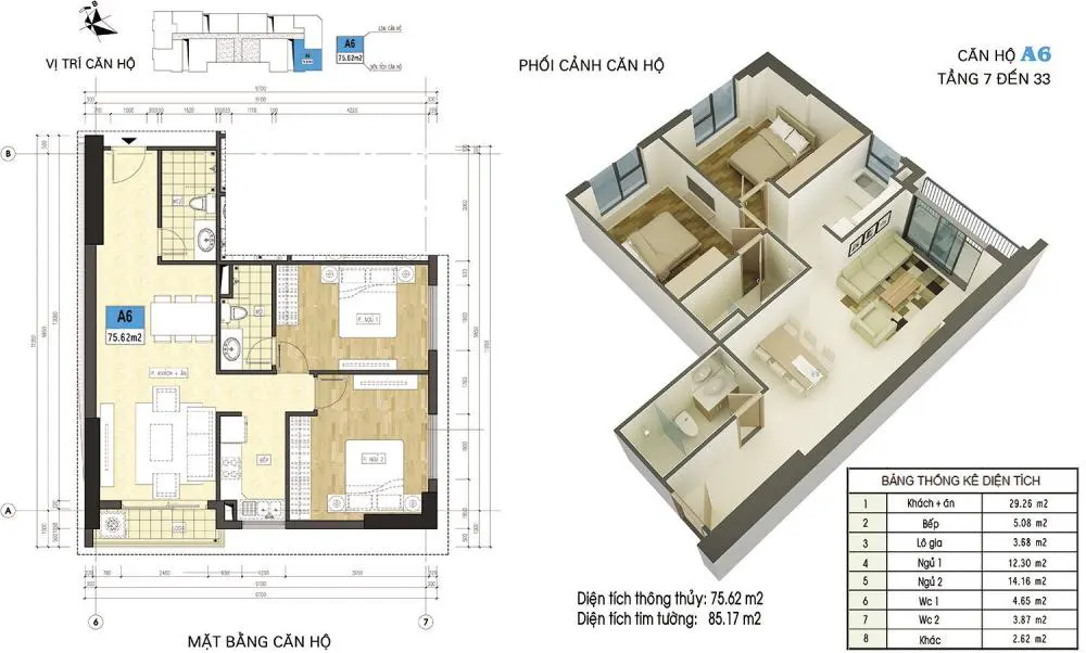 Sơ đồ thiết kế chi tiết căn hộ A6 Xuân Mai Riverside