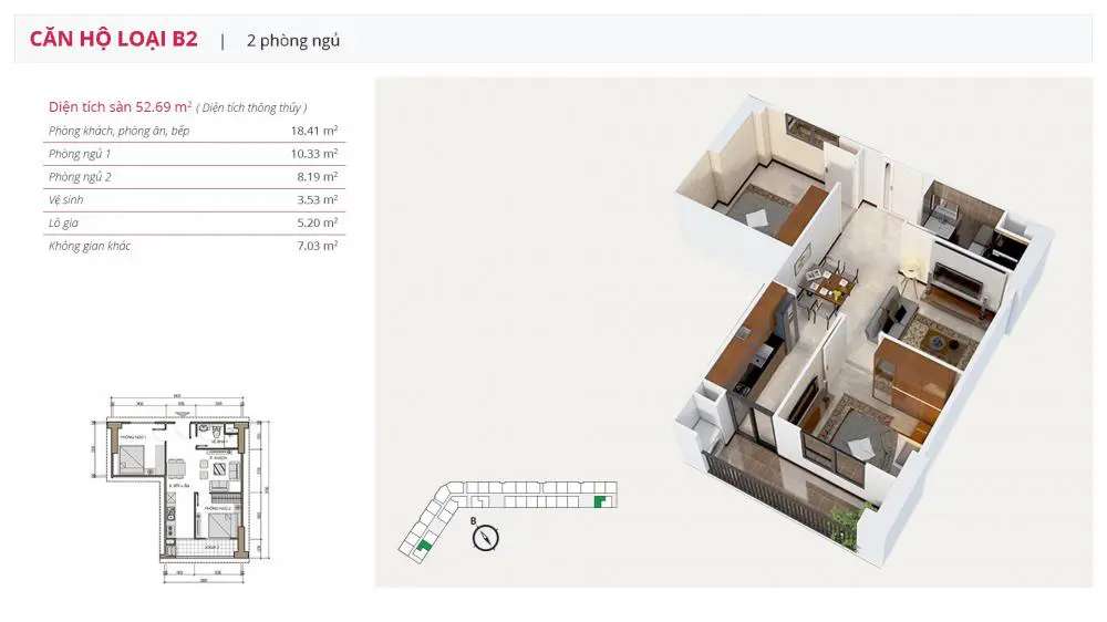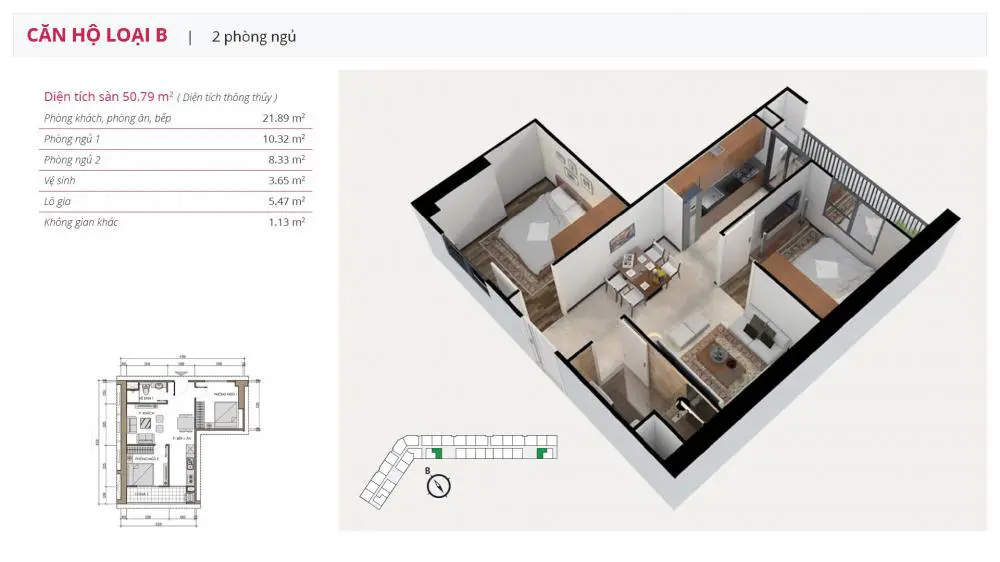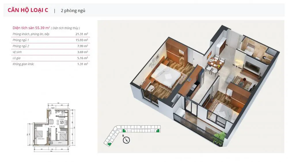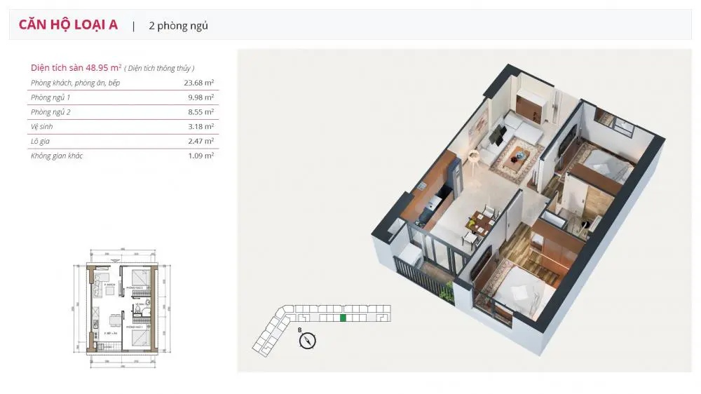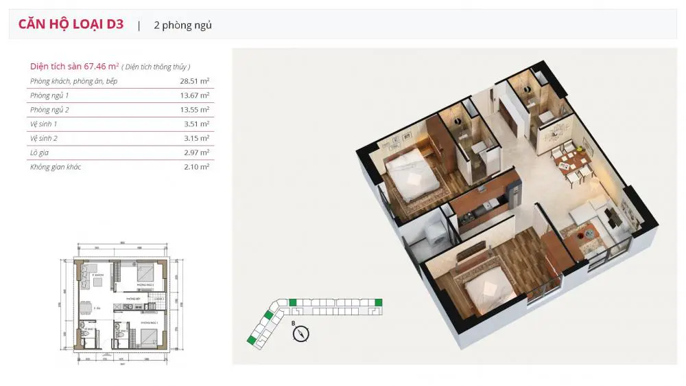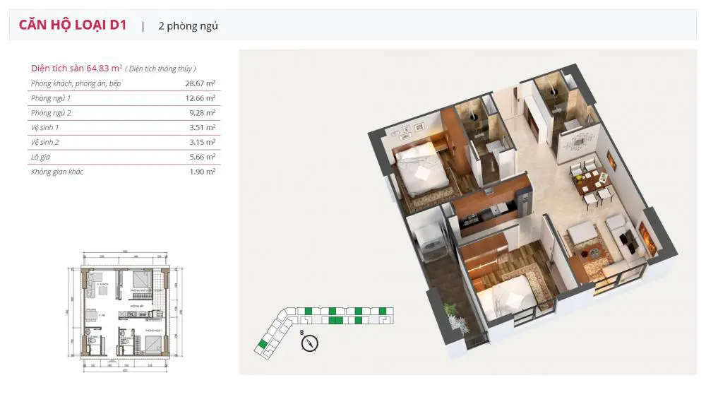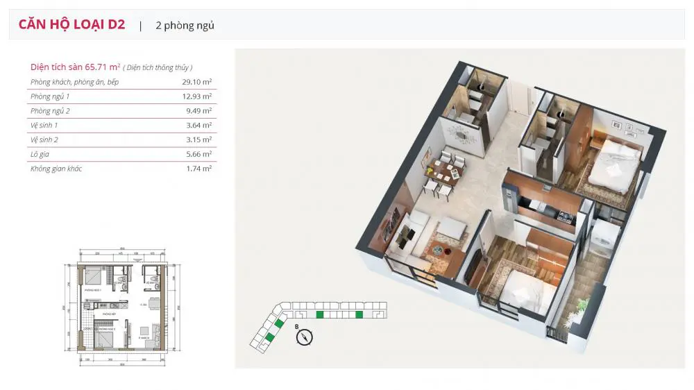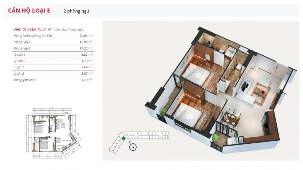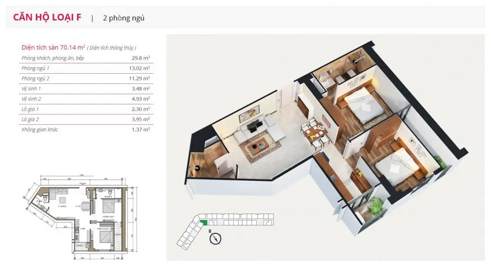 Mặt bằng thiết kế căn hộ 02 phòng ngủ: