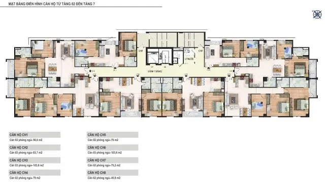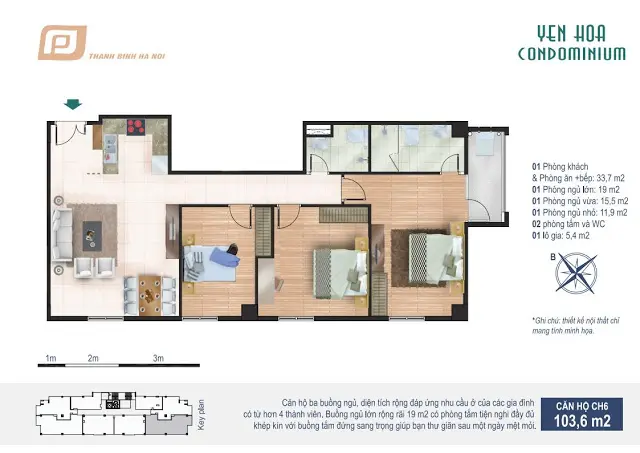 - Căn hộ CH6 rộng 103,6m2 gồm 3 phòng ngủ, 2 WC
