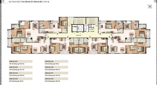- Căn hộ CH8 rộng 45,8m2 gồm 2 phòng ngủ, 1 WC