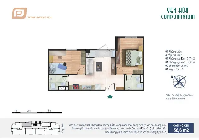 - Căn hộ CH1 rộng 56,5m2 gồm 2 phòng ngủ, 2 WC