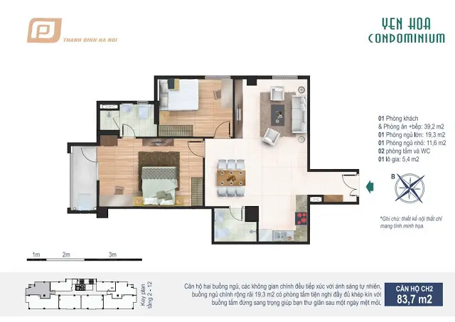 - Căn hộ CH2 rộng 83,7m2 gồm 2 phòng ngủ, 2 WC