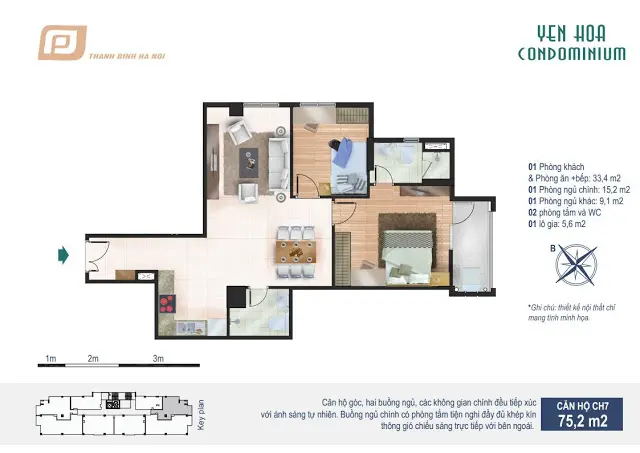 - Căn hộ CH7 rộng 75,2m2 gồm 2 phòng ngủ, 2 WC