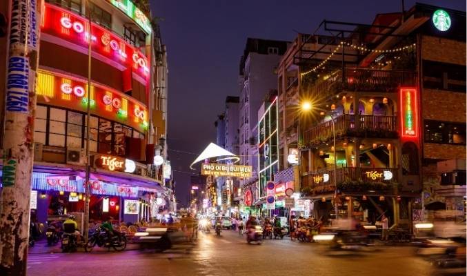 Đường Bùi Viện, tọa lạc ngay trung tâm Quận 1, TP.HCM, là một địa điểm sôi động và nổi tiếng được biết đến như khu phố Tây thu hút du khách quốc tế cũng như người dân địa phương. Nơi đây là điểm đến lý tưởng để khám phá nhịp sống nhộn nhịp về đêm của Sài Gòn, nơi mọi người có thể tận hưởng bầu không khí náo nhiệt, tràn đầy năng lượng và đậm sắc màu hiện đại của thành phố.
